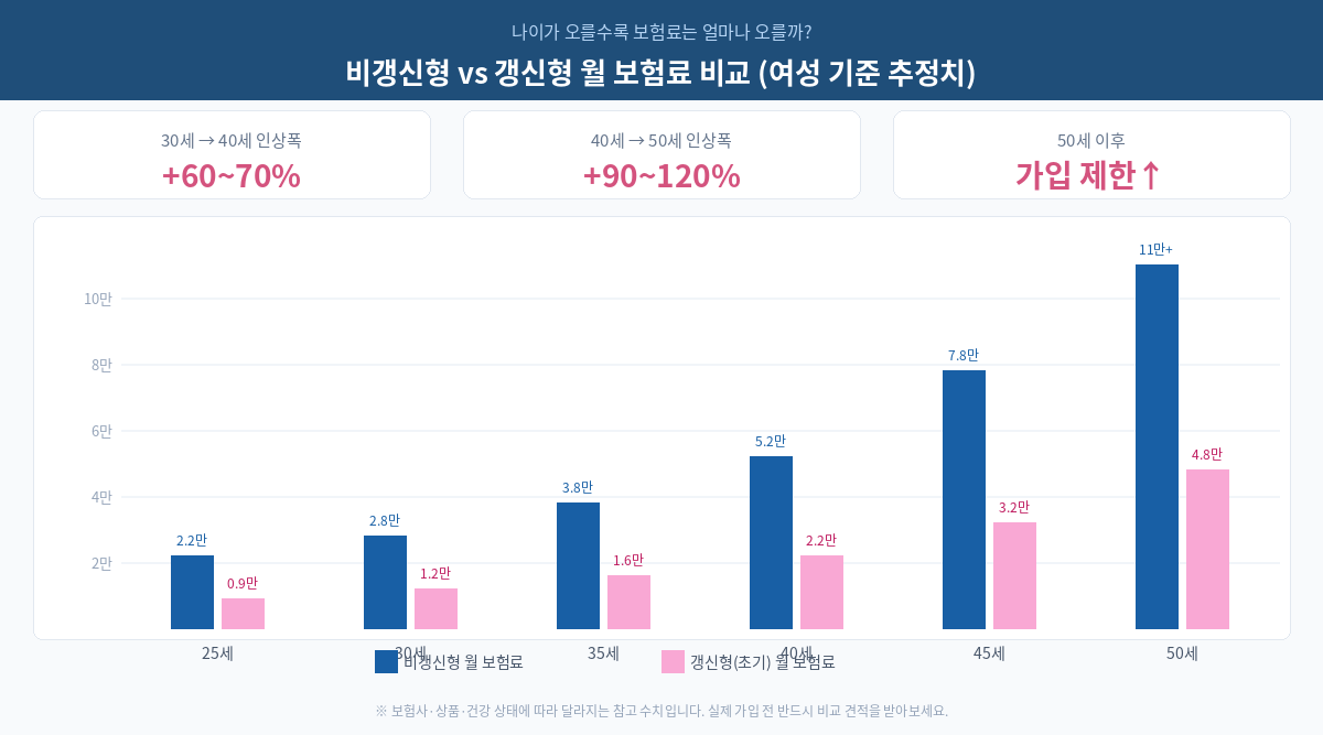 | 장기 보험료 | 갱신 시마다 인상 | 고정 (유리) |