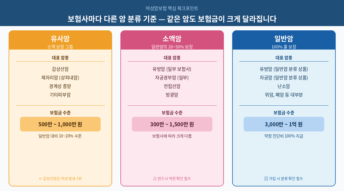 • 유방암, 자궁경부암, 자궁체부암, 난소암 → 일부 보험사에서 '소액암' 또는 '특정암'으로 분류