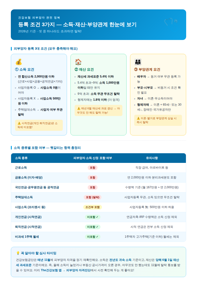 피부양자 자격을 유지하려면 소득 요건, 재산 요건, 부양관계 요건 세 가지를 동시에 충족해야 해요. 셋 중 하나라도 기준을 초과하면 바로 탈락이에요.