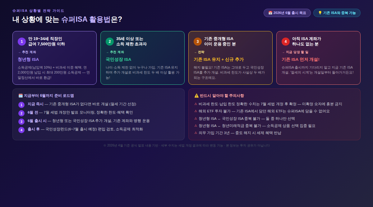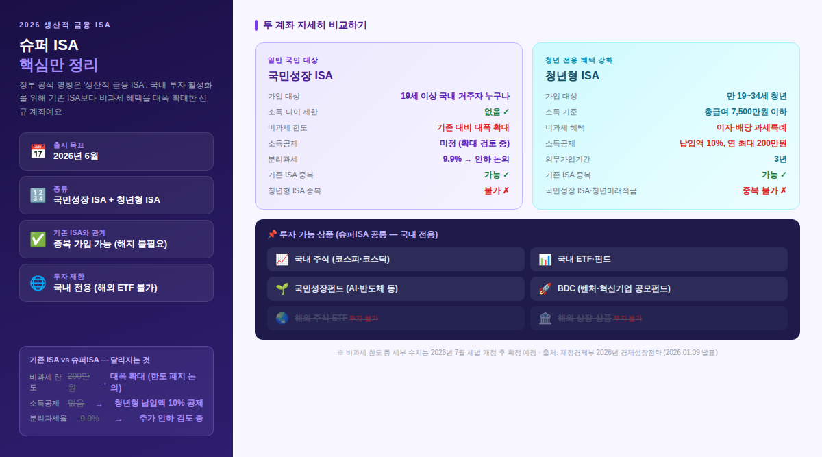 | 📌 핵심 요약: 슈퍼 ISA = 생산적 금융 ISA (공식 명칭) · 2026년 6월 출시 목표 · 국민성장 ISA + 청년형 ISA 두 종류 · 기존 ISA와 중복 가입 가능 |